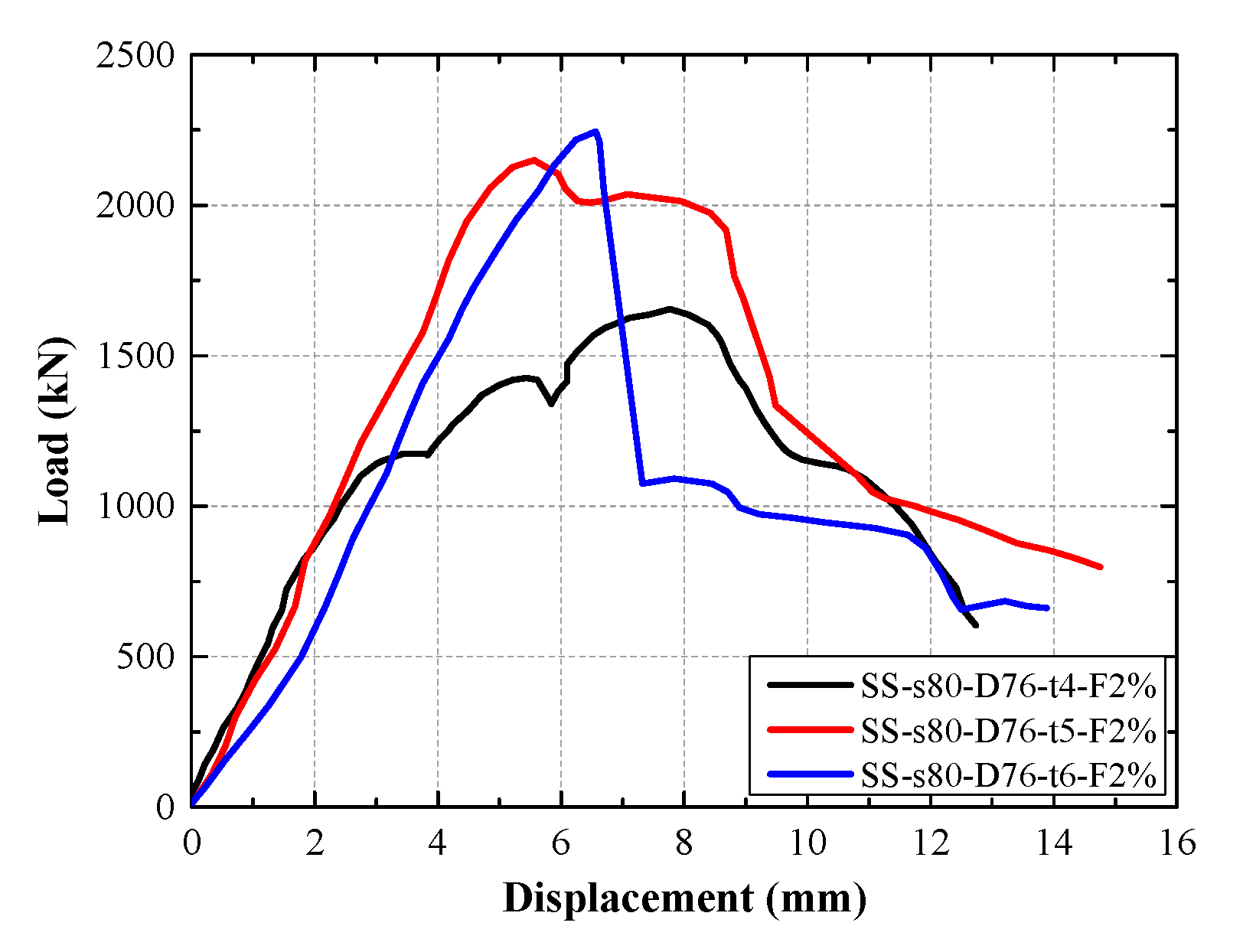 The load–displacement curves of composite columns specimens with different steel tube thicknesses are shown in