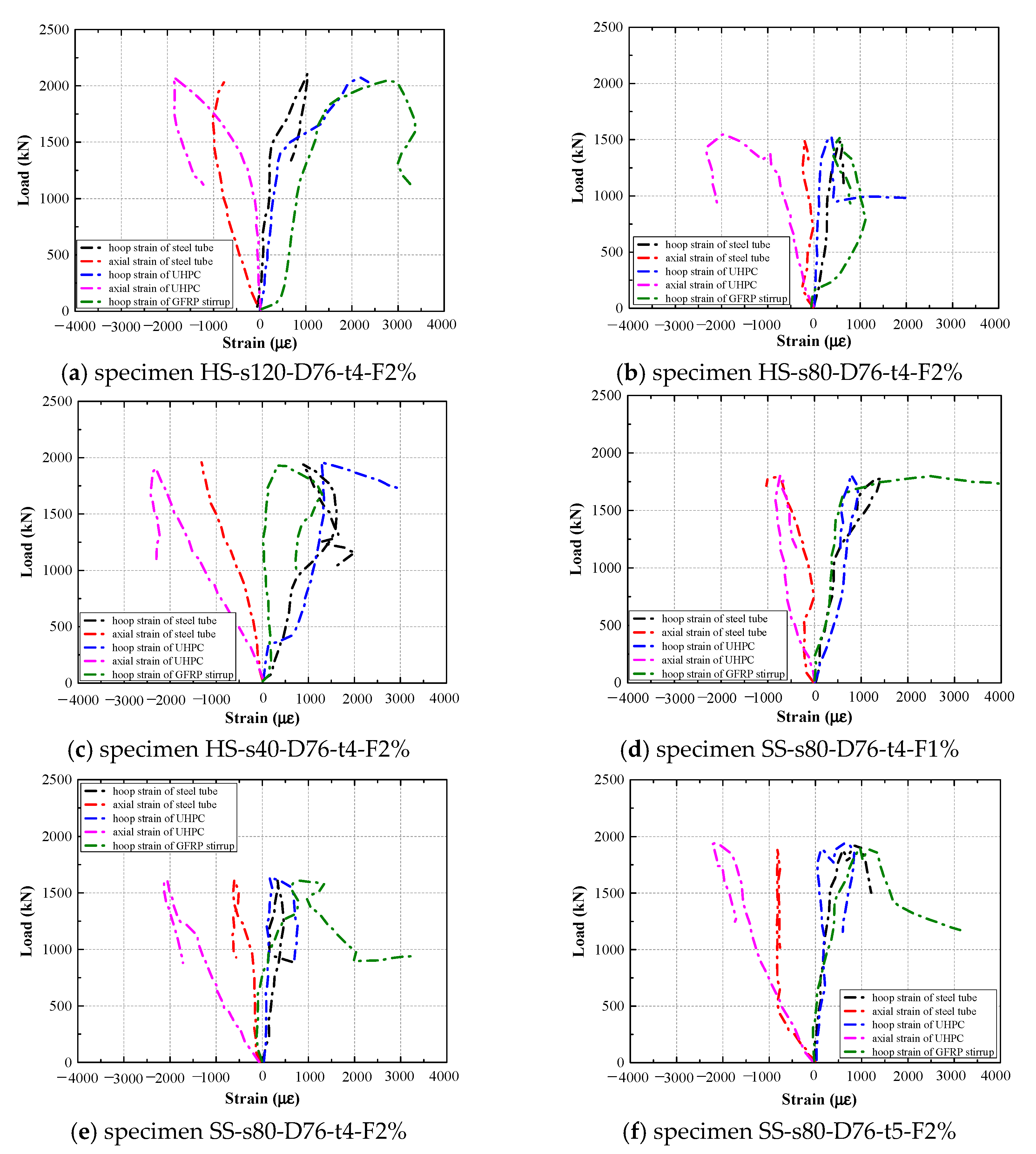 Figure 11a, as the thickness of the steel tube increases, the axial strain of the composite column decreases. This trend occurs because a thicker tube possesses higher stiffness, leading it to carry a greater share of the axial load. Consequently, the outer concrete experiences reduced stress, resulting in lower axial strain. In the case of the 6-mm-thick steel tube, the UHPC exhibits the highest hoop strain with increasing load. This is attributed to the high stiffness of the thicker tube, which resists deformation and weakens the composite action between the steel tube and the outer concrete. As the two components behave more independently, the concrete is subjected to greater transverse expansion, leading to increased hoop strain.