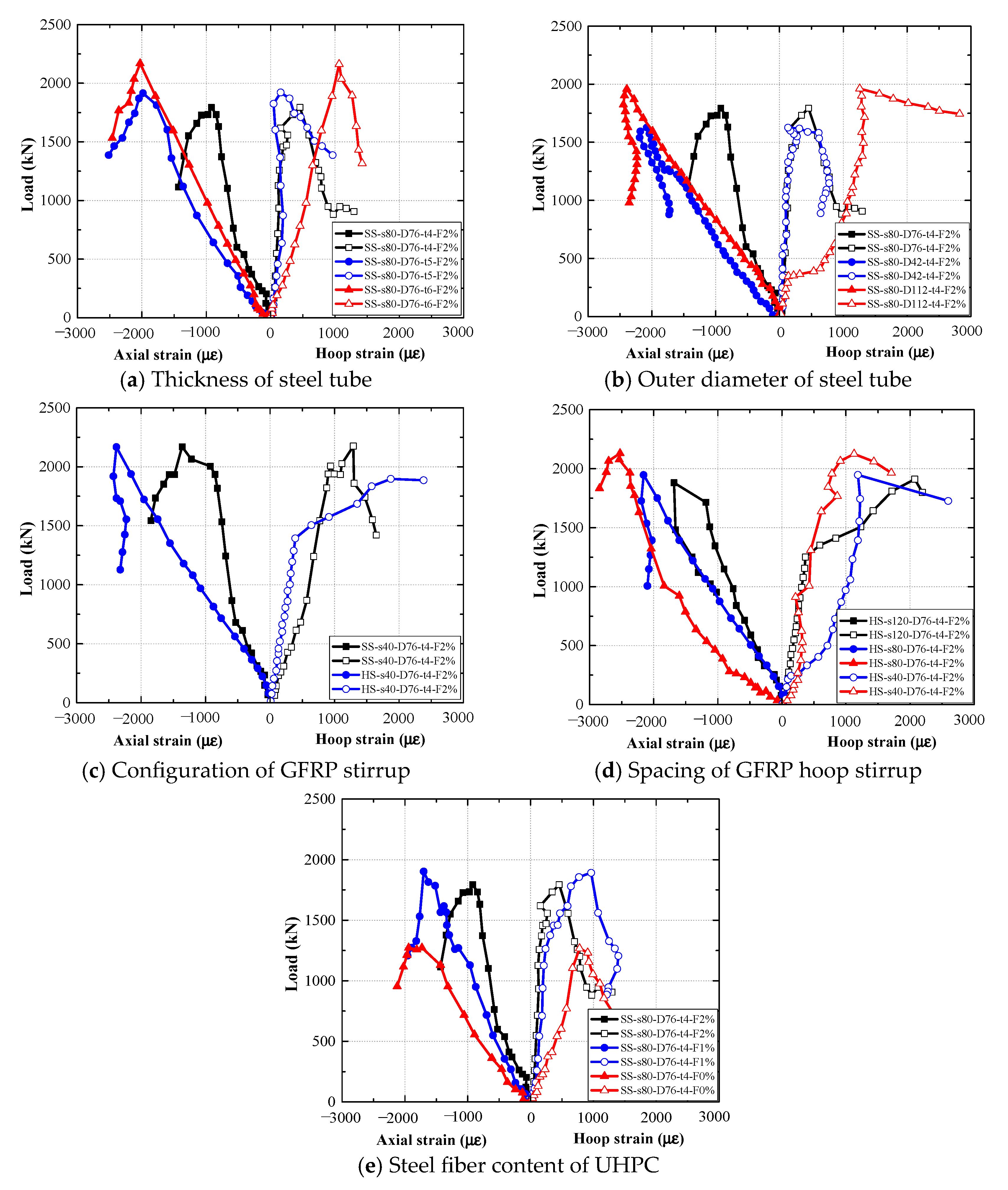Figure 6. Specimen SS-s80-D42-t4-2% showed about 47.81% and 26.36% increases in peak load, respectively, compared to specimens SS-s80-D76-t4-2% and SS-s80-D112-t4-2%. This positive improvement of the composite column with a decrease in outer diameter of the steel tube is attributed to the increased cross-sectional areas of both the steel tube and the core concrete, which contribute to higher overall structural resistance.
