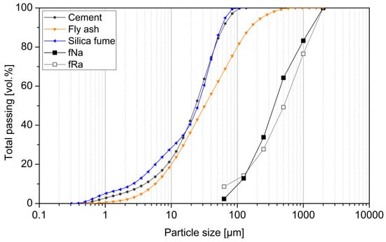 As expected, the fRAs used in this research have: (i) worse properties than the fNA (with a water absorption that is 6.85% larger in absolute terms) and lower density (this is relevant since the replacement of fNA by fRA was carried out by volume) and (ii) better properties (lower water absorption and higher density) than the average properties expected from fRA produced from concrete waste []. It is a consequence of these fRAs being produced from well-controlled concrete waste. Particle size distribution of used materials is presented in Figure 1.