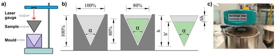 A steel mould, lined with a friction-reducing foil, was filled with the sample and compacted, with a flat reflective measurement point placed on the upper surface. The distance to the reference point was measured with an accuracy of 2 μm at 5 min intervals. Given the geometry of the sample, the change in height measured by the cone corresponds to the volume change.