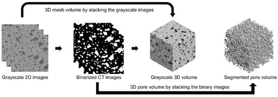Figure 5 illustrates the micro-CT imaging process. The solid and pore structures of the samples were analysed, with an emphasis on key aspects of the pore structure, including porosity, pore size distribution, and pore shape [], due to their influence on material properties. The imaging process involved scanning the prepared specimens to produce a series of 2D images, which were subsequently reconstructed into 3D representations, as shown in Figure 5. These 3D images, saved in 8-bit format, utilised 256 grayscale values (ranging from 0 to 255) to denote the relative density of different regions. To enhance the visualisation of pore features, image segmentation was performed using a modified Otsu method in combination with manual threshold adjustments []. The reconstructed 3D images for each specimen comprised 670 × 670 × 670 voxels, with a pixel size of 2.6 μm. These 3D volume data sets were further divided into layers to facilitate detailed analysis of the pore structures.