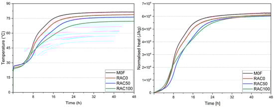 An adiabatic calorimeter (Controls S.p.A., Italy) was used to monitor the temperature rise of the concrete mix during the first 48 h of the hardening process. The measurements were performed on 150 mm cubic specimens following EN 12390-15 []. Four concrete mixes—M0F, RAC0, RAC50, and RAC100—were prepared and tested. All materials were conditioned at an ambient temperature of 20 °C ± 2 °C prior to testing.