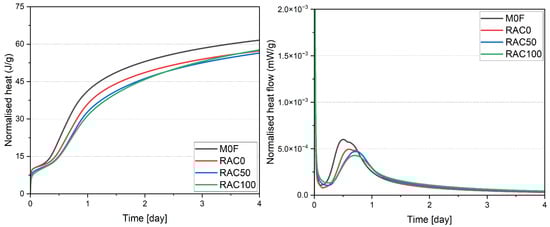 where: qt is the heat release at a time, Ccon is the total heat capacity of the concrete specimen alone, is the intrinsic temperature rise, mcon is the mass of a concrete sample. The total heat capacity of the mix was determined using the specific heat capacity of the mix constituents following the EN 12390-14 [].