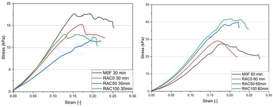 The preliminary buildability performance of the mixes was evaluated using an unconfined uniaxial compression test, similar to the method used in [,,]. This test measures the stress–strain relationship of the mix at early ages. The primary outcomes of the test are the maximum green strength and the green Young’s modulus.