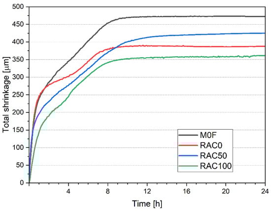 The effect of RCP and fRA on the total shrinkage development within the first 24 h was examined for all composites. Previous research [] has indicated that this time frame is critical for the deformation of 3D-printed concrete, primarily due to increased water evaporation and the lack of traditional formwork. Shrinkage testing was performed using the shrinkage-cone apparatus manufactured by Schleibinger (Buchbach, Germany). The testing concept and measurement setup are depicted in Figure 2.