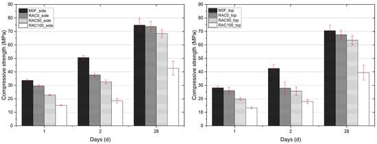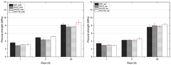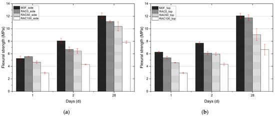 The hardened 3DPC strength properties were tested according to EN 1015-11 [] on both standard and printed samples. The printed samples were extruded through a rectangular nozzle (50 × 8 mm) and consisted of six layers. After 20 h of hardening, they were trimmed into prismatic specimens with dimensions of 40 × 40 × 160 mm. Until cutting, the samples remained covered; afterwards, they were trimmed, labelled, and cured by full immersion in water at 20 °C. The tests were conducted in two orientations: top, where the load was applied vertically to the printing direction, and side, where the sample was loaded horizontally to the printing direction (Figure 3). For flexural and compressive strength testing, 3 and 6 specimens were taken, respectively, with the mean value considered representative.