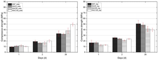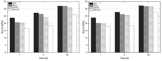 The initial and stabilised elastic moduli of prepared 3DPC were determined in accordance with EN 12390-13 [] on Φ100 × 200 mm samples after 1, 2, and 28 days of curing. Three samples were tested in each set, using a Zwick Toni Technik hydraulic press and a set of three electronic gauges.