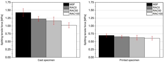 The interlayer adhesion was tested by the splitting test method according to European Standard EN 12390-6 []. A similar method was performed in []. The tests were conducted on cubical specimens with edges of 40 ± 5 mm after 1 day of curing. The splitting tensile strength ( [MPa]) was calculated according to the EN 12390-6 [] as shown in Equation (6):