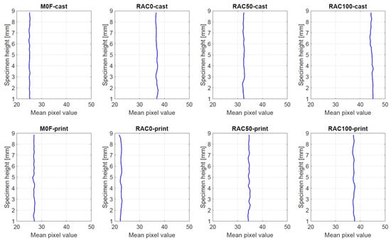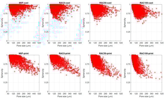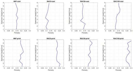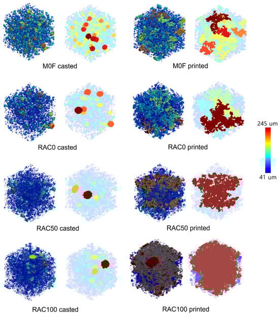 The incorporation of fRA affects the properties of cementitious materials, affecting both their solid and pore characteristics. In this study, the microstructural attributes of representative cast and printed samples, with and without fRA, were analysed using X-ray micro-computed tomography (micro-CT) on specimens with dimensions of 20 × 20 × 20 mm that were scanned using the Waygate Technologies V|tome|xS (Bruker, Portland, OR, USA). The operating voltage of the lamp was 170 kV and the current intensity was 300 μA and, at a magnification of ×10.6, a voxel size of 18.77 um3 was obtained.