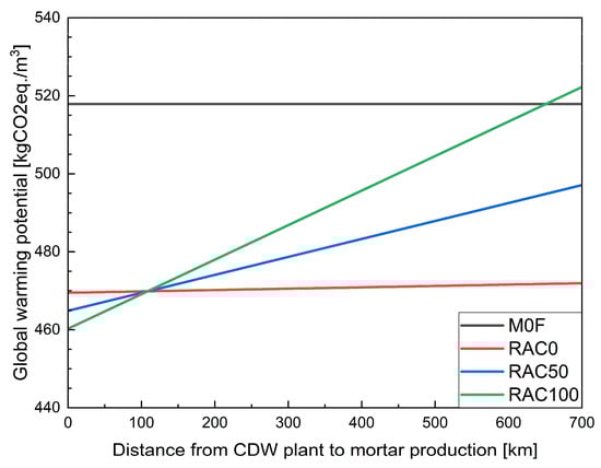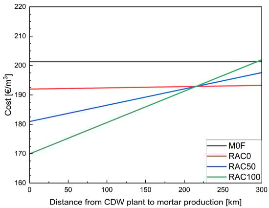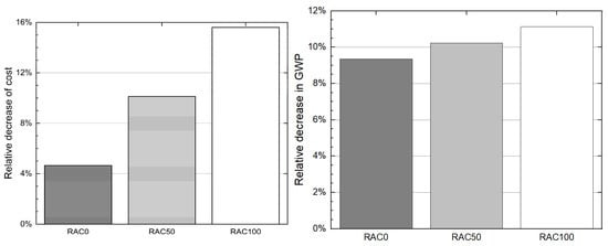 The impacts of replacing cement with RCP and natural sand with fRA are analysed in three main categories: the content of fRA and RCP, the global warming potential (an indicator of equivalent CO2 emissions to the atmosphere), and the cost of each mix. The content of fRA and RCP is relevant since the primary motivation for the use of recycled aggregates in cementitious materials is the recovery of CDW and the minimisation of the extraction of natural resources []. Global warming potential is assessed since it is a key environmental impact indicator whose reduction is being sought by society, with specific mentions to the construction sector in the European Green Deal [] and clearly defined ambitious targets in the roadmaps of cement associations, including CEMBUREAU [] and the GCCA []. Cost matters since economic considerations have been stated as one of the factors for the low uptake of recycled aggregates by the concrete industry [], as argued in [], where it was found that, for some scenarios concerning a Portuguese case study, the incorporation of recycled aggregates may decrease the GWP of ready-mixed concrete but may not be cost-competitive—this happens because aggregates are bulk materials with low production cost but high transport cost [].