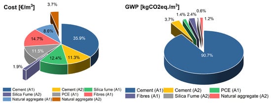 - The environmental and economic impacts of the production of cementitious materials lie primarily on the production and transport of raw materials, with little impact due to information module 3—the GWP and cost of several concrete mixes presented in scientific publications was determined in [] and the impacts of concrete production are well below 5% of the impact of raw material production and transport.