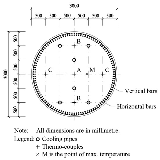 Extensive studies [20,21,22] have been carried out to develop systematic techniques for optimizing the structural performance of concrete buildings, but there have been only a few studies for optimizing the thermal performance of temperature control regimes to be applied to curing concrete members. In this paper, a case study in Hong Kong on the thermal analysis and temperature control of C80 concrete with a total cementitious content of 580 kg/m3 cast into massive columns is presented. The temperature control limits adopted are based on CIRIA C660 [8] and ACI 201.2R-16 [9]. Due to the high cementitious content of the concrete and the large size of the columns, internal water-cooling pipes were installed. Full-scale trial casting of a 3.0 m-diameter C80 concrete column was carried out to test the effectiveness of the cooling pipes and to verify the thermal analysis. Then, different cooling-pipe arrangements were tried in the thermal analysis, and the cooling-pipe design was optimized by minimizing the peak temperature and temperature differential within the concrete pour. By the time of writing this paper, all concrete casting of the massive C80 columns has been completed, with no exceedance of temperature control limits and no observable thermal cracks.