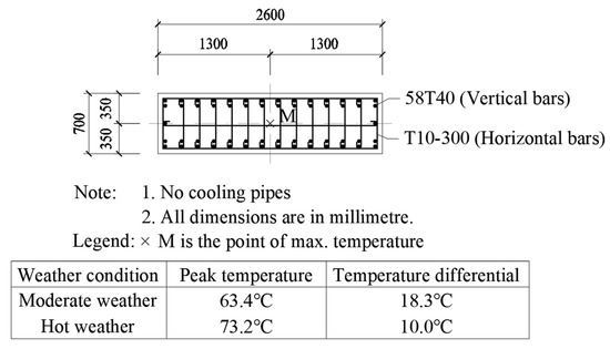 In Figure 6, it can be seen that, for a 1.5 m-thick rectangular section (2.5 m × 1.5 m) column, three evenly spaced cooling pipes along the longer axis need to be provided for complying with the temperature control limits. In Figure 7, however, it can be seen that, for a 0.7 m-thick rectangular section (2.6 m × 0.7 m) column, no cooling pipe needs to be provided. Hence, for rectangular section columns, the thickness is the governing factor in the design of the water-cooling system. In fact, it has been found that all the rectangular section columns with a thickness ≤ 0.7 m do not need any cooling pipe.