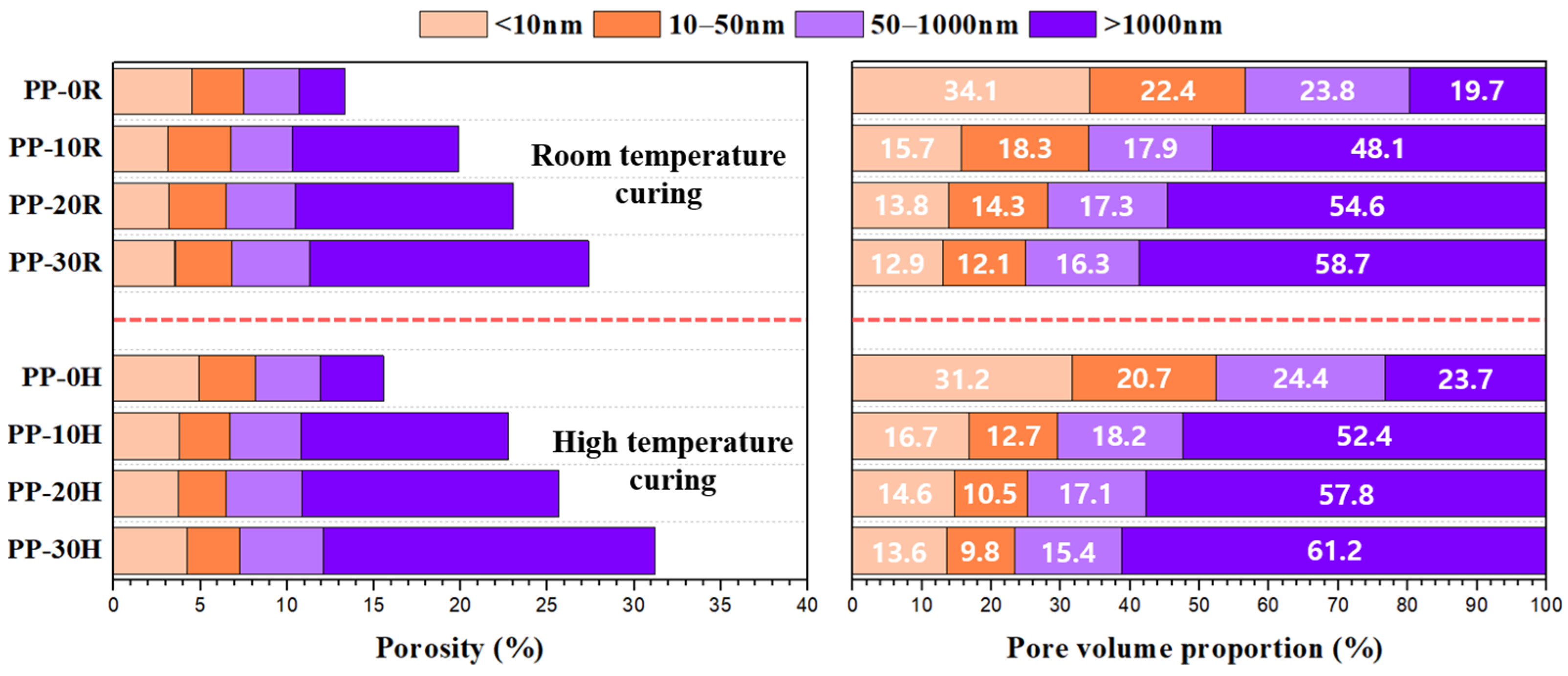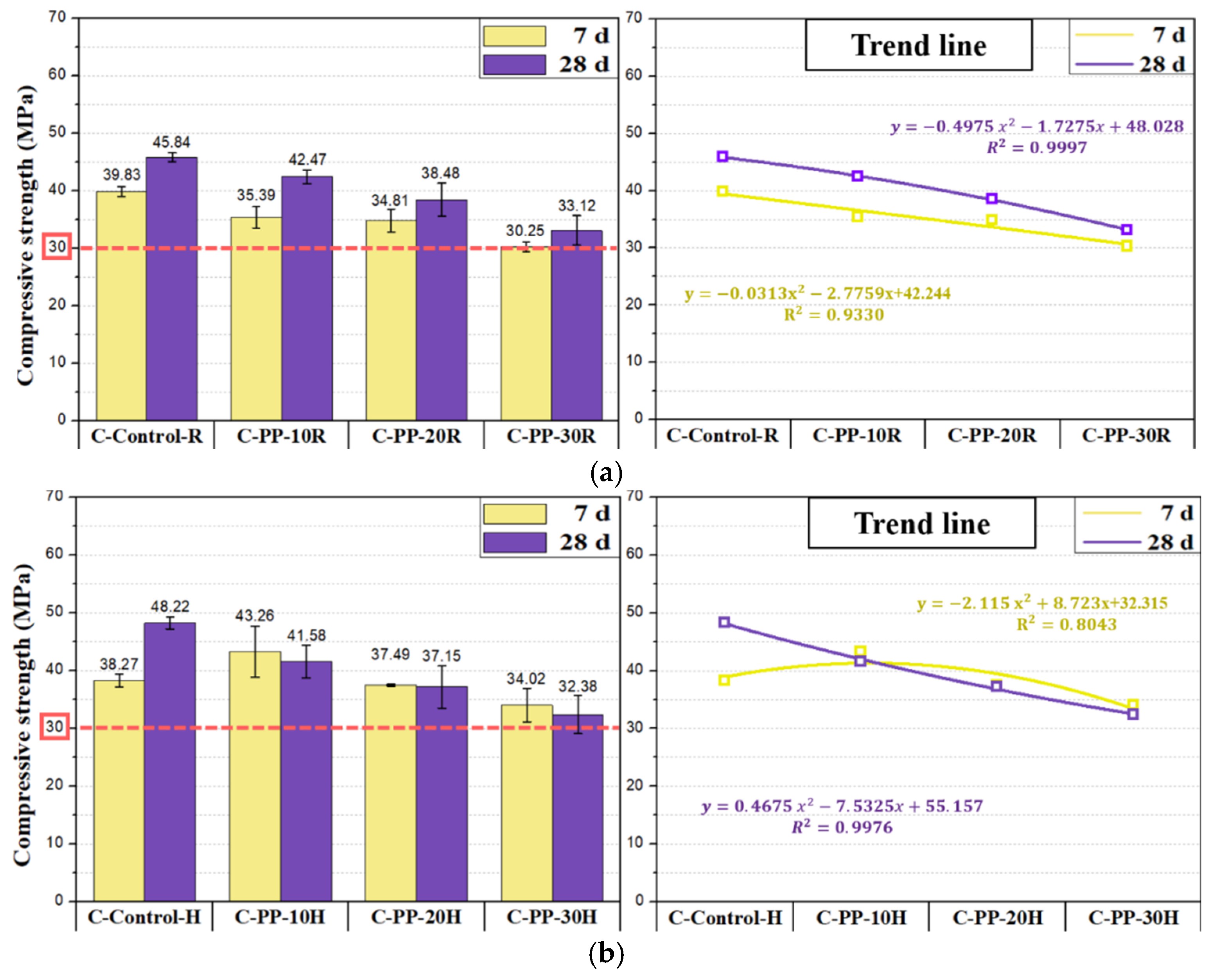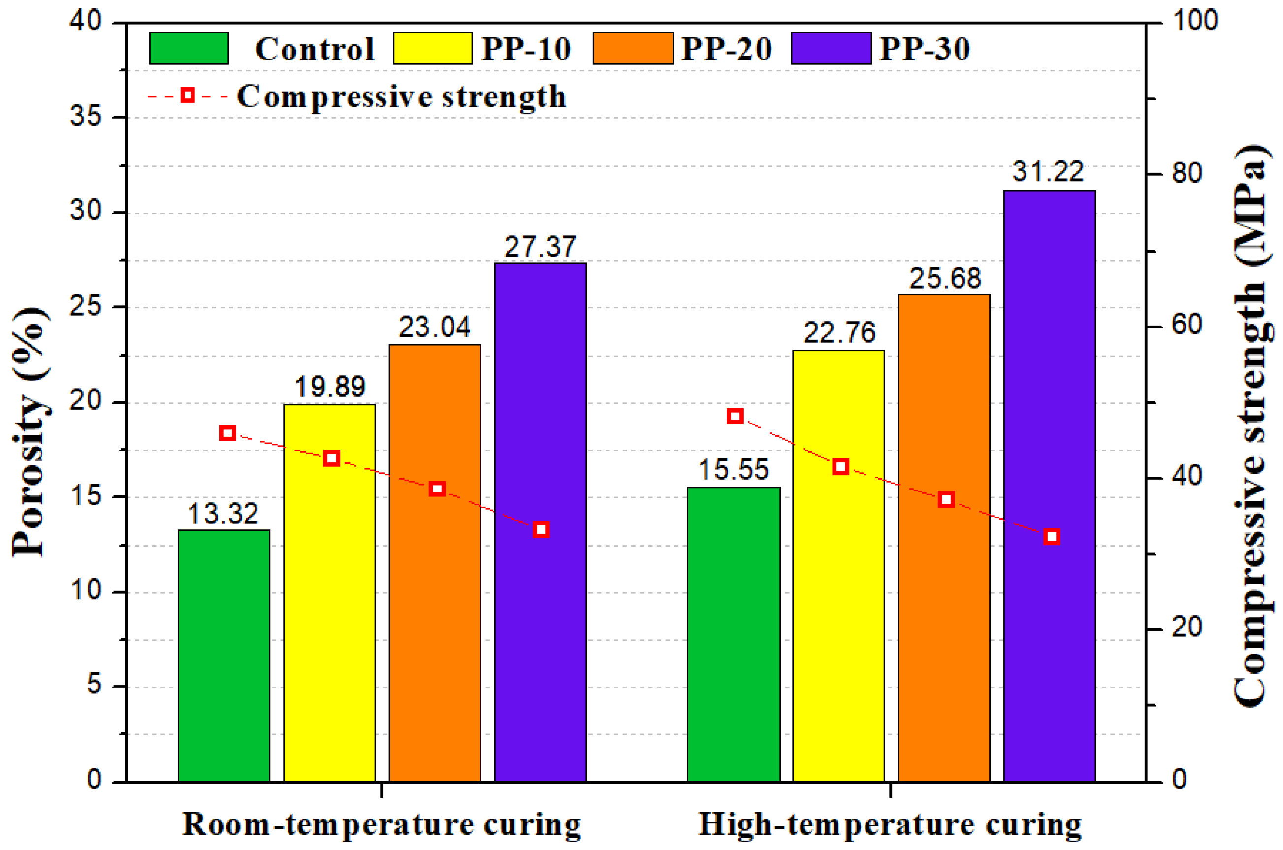 - Increased PP content reduced compressive strength under all curing conditions owing to poor bonding and interruption of hydration. HT curing accelerated early strength but decreased long-term strength because of microcracks and porosity.
