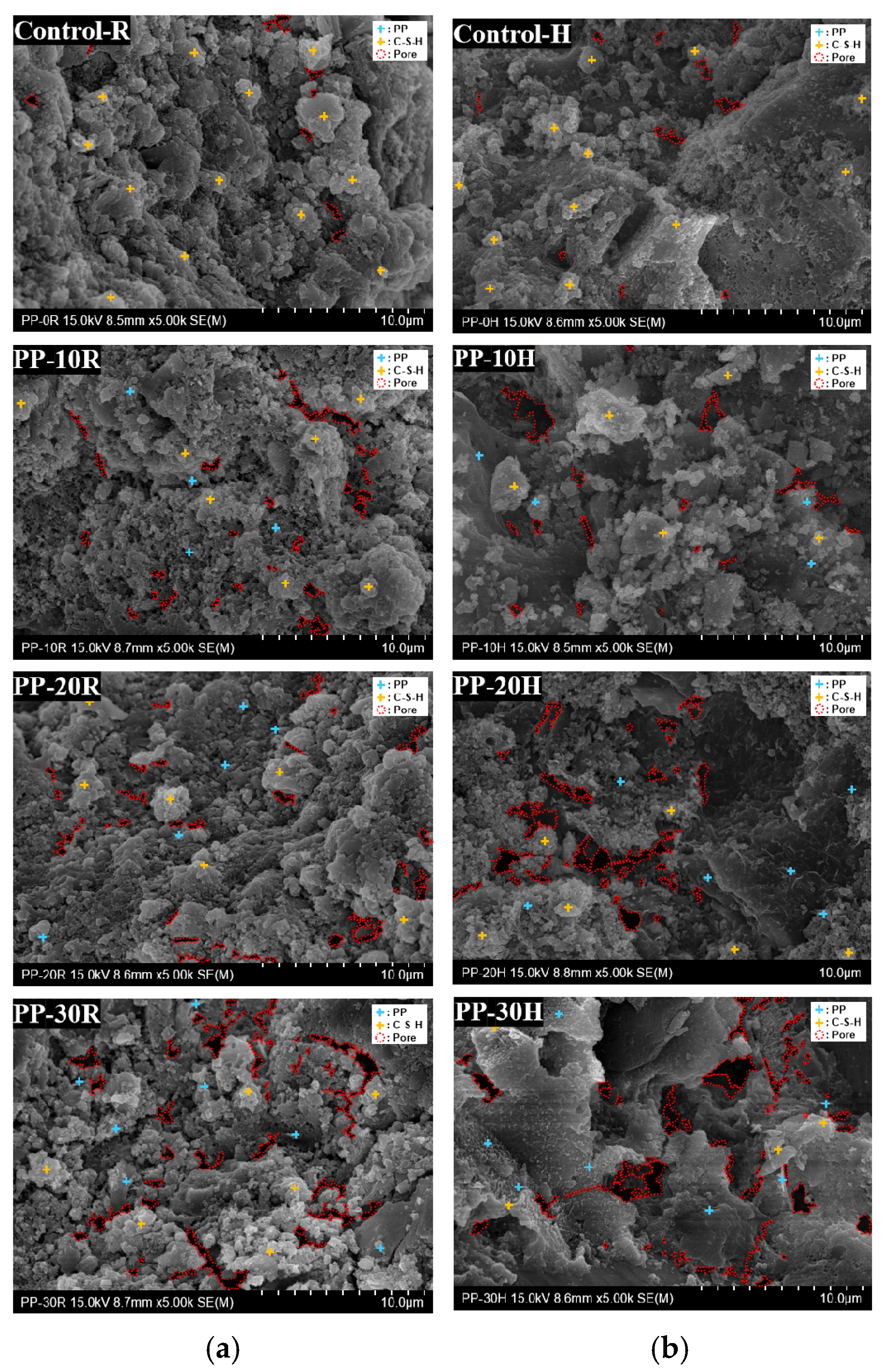 - FE-SEM and MIP confirmed increased porosity and altered pore structure with PP addition. HT curing resulted in the formation of multi-scale pores and defects due to PP shrinkage and expansion, lowering structural integrity. As a result, the compressive strength of the PP cementitious composite decreased by up to 30%.