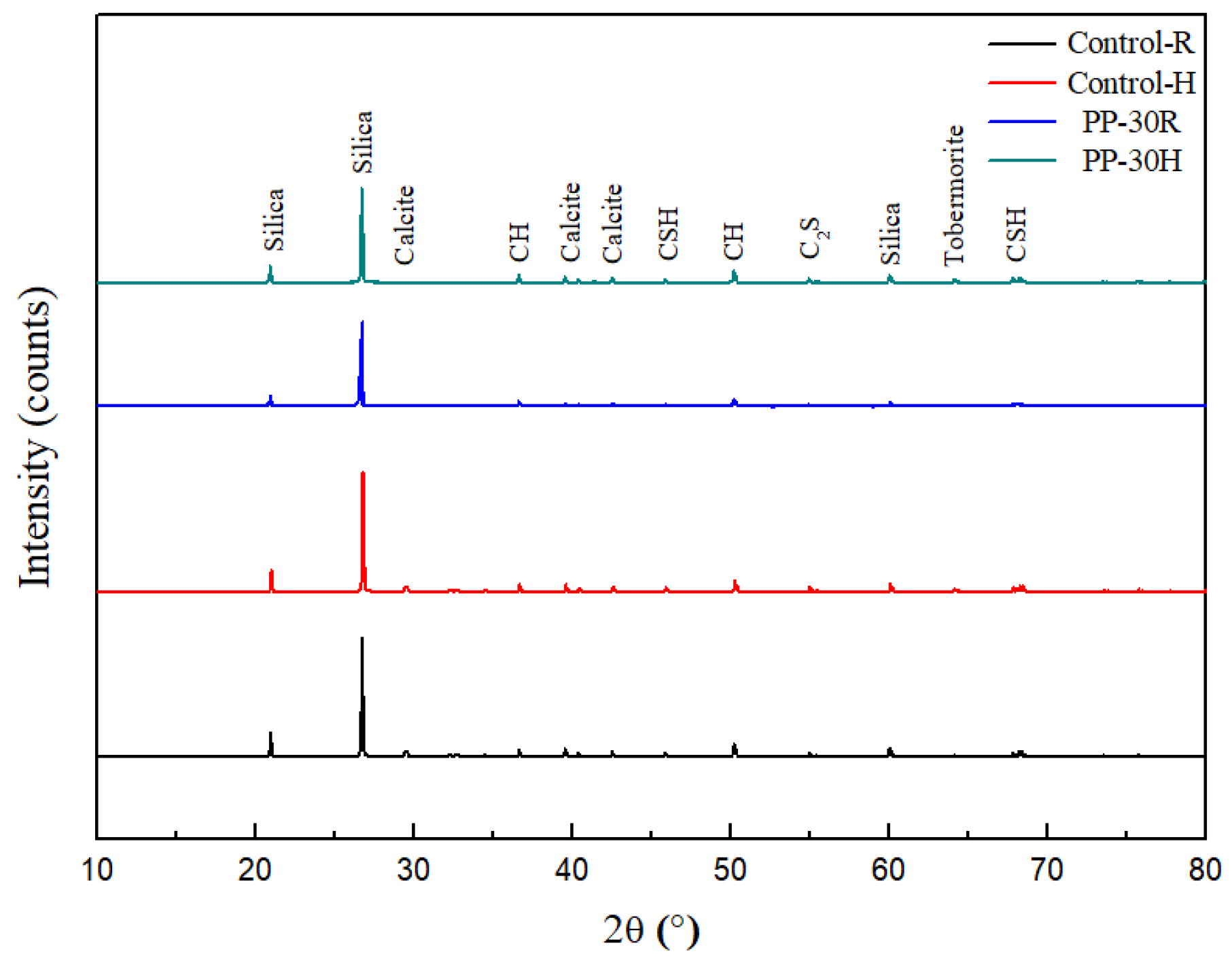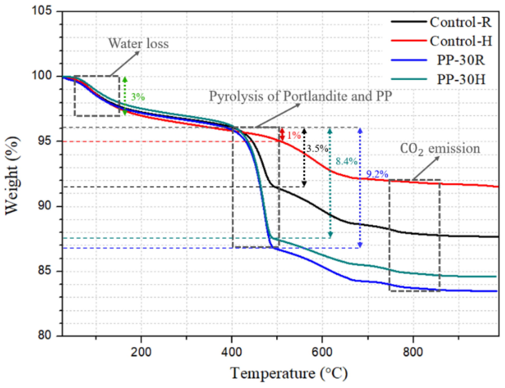 - XRD results indicated that PP did not chemically react with the components of the cementitious composite and interfered with hydrate formation. The HT promoted hydration, but the resulting products did not improve mechanical strength owing to microstructural defects in the cementitious composite. TGA revealed greater weight loss with higher PP content owing to thermal decomposition and reduced hydration.