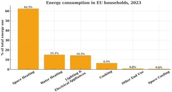Energy consumption can be examined in sectors such as Transport, Industry, Household, Services, Agriculture and Forestry, and other sectors. If these sectors are examined according to total energy consumption in EU countries, transportation, industry, and household consumption are dominant. Household energy consumption holds 25.8% of the total energy consumed in EU countries in 2022, and 26.2% in 2023 []. Figure 1 displays the energy consumption report of Eurostat in 2023, where consumption areas in a household can be categorized into space heating, water heating, lighting and appliances, cooking, space cooling, and others. Space heating accounts for the highest rate of energy consumption in a household. In EU countries, 62.2% of the energy consumption in households in 2023 was for space heating []. These rates clearly show that the energy consumed for space heating is significant compared to other consumption areas.