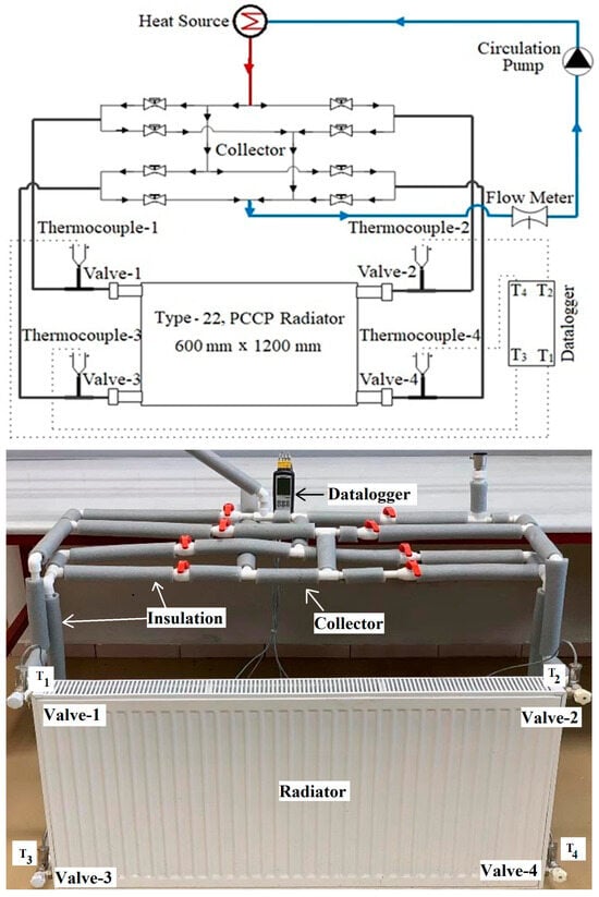 The experimental setup to determine the heat transfer from the type-22, PCCP radiator (Warmhaus, Bursa, Türkiye) (height: 600 mm–width: 1200 mm) is shown in Figure 2.