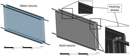 Figure 3 displays the geometric model suitable for CFD analysis. The water volume shows the extracted flow path of water that flows through the panel radiator, and the solid volume corresponds metal radiator surfaces.