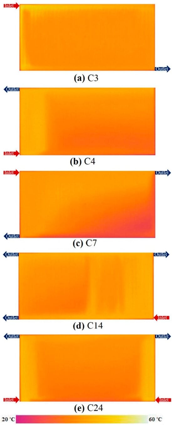 Some of the remarkable images showing the temperature distribution on the radiator surface obtained by the thermal camera are examined in this section. In addition, these images exhibited in Figure 4 give clues about the flow distribution in the ducts of the radiator.