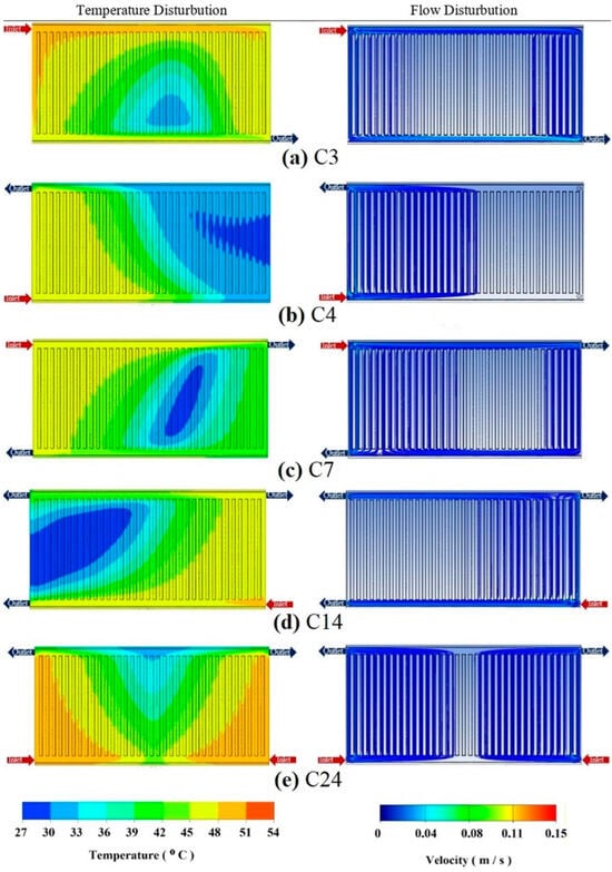 displays the numerical results obtained by the CFD solution. CFD results showed detailed information about temperature and flow distribution in the radiator. The temperature distribution remarkably changes depending on the inlet and outlet positioning. In C3, the flow distribution showed that most of the flow rates traverse the top and bottom borderlines and the left and right sides of the radiator. In C4, there are regions of nearly zero velocity for the left half of the radiator. In C7, there are regions of nearly zero velocity, but most of the radiator’s inner lines have flow. In C24, the figure shows that there are two flow trends: one between the left side inlet and outlet couple, and one between the right side inlet and outlet.