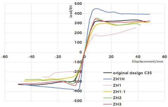 - Comparing the skeleton curves of ZH1 and ZH1H, it can be seen that the use of unsupported local section steel–concrete reinforcement and replacement method not only increases the initial stiffness of the wall, but also maintains high ductility and a relatively full hysteresis loop after reaching the peak bearing capacity. The minimum peak horizontal bearing capacity of composite shear walls is not less than 422 kN, which is greater than the peak horizontal load of defective concrete at 242 kN, and also greater than the original design’s concrete strength of C35 at 327 kN. It can be seen therefore that the reinforcement of RC shear walls via unsupported-roof steel-reinforced concrete local strengthening and replacement can significantly improve the bearing performance of composite shear walls and the collaborative working performance between replacement and non-replacement areas by increasing the bearing capacity on both sides of the end to achieve the ability of composite shear walls to continue bearing even after the concrete damage and softening in the non-replacement area.