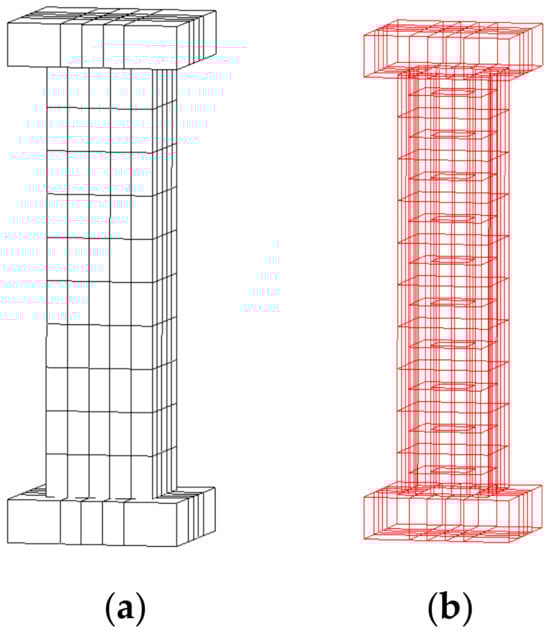 Due to the lack of data on replacement reinforcement tests considering stress hysteresis, this article compares the experimental results of reinforced RC columns using the increased cross-section method []. The strength grade of the original column concrete is C20, the longitudinal reinforcement ratio of the original column is 1.53% (four corner bars with a diameter of 14 mm), the hoop ratio is 0.301% (hoop spacing of 150 mm, diameter of 6 mm), the column section size is 200 mm × 200 mm, and the loading form is one-time force (no external load applied). The newly reinforced concrete has a thickness of 60 mm, and the cross-sectional size after reinforcement is 320 mm × 320 mm. The strength grade of the reinforced concrete is C35. Four steel bars with a diameter of 12 mm and stirrups with a diameter of 6 mm and a spacing of 150 mm are added for reinforcement. The loading method is secondary force (after the maintenance is completed, a prestressing force of 341.2 kN is applied through non-bonded external prestressing using prestressed steel strands). To prevent stress concentration at the bottom of the concrete components in the early stage and then terminate the calculation, rigid pads are established at both ends of the column for force transmission. The finite element division is shown in Figure 6 below: