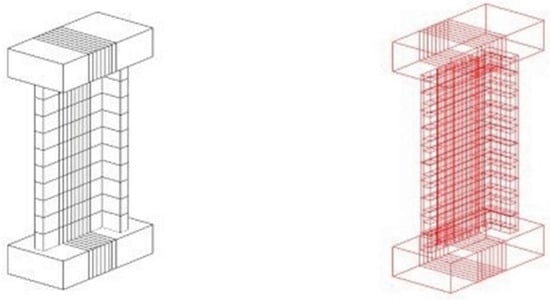 The model’s basic information is shown in Table 3, and the model dimensions and replacement sequence are shown in Figure 8. The entire cross-section of the shear wall is divided into four sections: non-replacement area, first batch replacement area, second batch replacement area, and third batch replacement area. The finite element model of the L-shaped shear wall and the finite element mesh of the steel reinforcement are shown in Figure 9. Add a concrete elastic block at the bottom and the top of the shear wall to simulate the test loading device, which is only used for force transmission and does not unload during the entire loading replacement process. Simulate the effect of dismantling and filling (hardening) in the area to be replaced by changing the elastic modulus, Poisson’s ratio, and self-weight of the concrete and internal reinforcement materials. Set the elastic modulus of the concrete and its internal reinforcement to zero, and apply the self-weight of the reinforcement and concrete in the opposite direction to simulate the dismantling effect; set the elastic modulus of concrete and its internal steel bars to normal values, and then add the self-weight of the steel bars and concrete in the area to simulate the filling (hardening) effect.