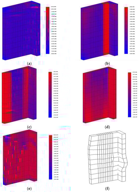 Vertical stress cloud map: (a) initial state; (b) area one replacement completed; (c) area two replacement completed; (d) area three replacement completed; (e) ultimate load; (f) ultimate load deformation of composite shear walls.