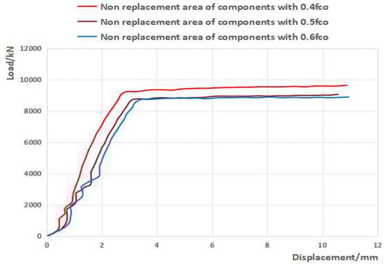 Vertical load–displacement relationship curve of non-replacement area (0.4fco, 0.5fco, 0.6fco).