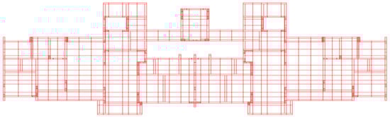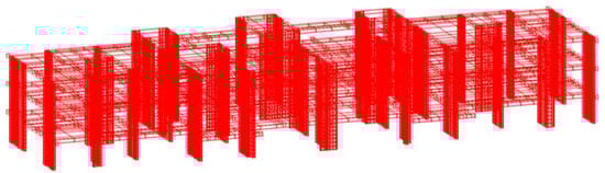 The three-dimensional solid degradation virtual laminated element nonlinear finite element analysis program VFEAP, is used to calculate and analyze the overall structure. After the demolition of the replacement area, C60 high-strength concrete will be used for filling treatment. Divide the bottom 1–3 floors of the structure into eight units from bottom to top, and divide each shear wall into three and four units along the section based on the number of blocks that need to be locally replaced. According to the permutation order, divide the shear wall units into sizes such as 200 mm × 700 mm × 800 mm, 1400 mm × 600 mm × 800 mm, and 600 mm × 950 mm × 800 mm; for beam and slab units, according to the division rules of shear wall units, sizes such as 600 mm × 800 mm × 400 mm, 1100 mm × 1300 mm × 400 mm, and 850 mm × 800 mm × 400 mm are used. To improve calculation efficiency, while ensuring calculation accuracy, the bottom three layers of the shear wall structure of the model are reinforced according to actual reinforcement, and the 4th to 18th layers of the model are set as elastic material structural layers. After construction reached the 10th floor, the insufficient strength of the bottom three layers of shear walls was discovered, so in the reinforcement construction simulation, no additional load was applied to the shear wall structure, and only the self-weight of the structure was considered. The finite element mesh distribution of the model is shown in Figure 15. To study the mechanical state of the 1–3 floors shear wall at the bottom of the structure during the subsequent structural construction to the top and during use, and even under ultimate load, the structure needs to be constructed on top of the 10th floor model foundation to the 18th floor. The actual loads of the project are read from the engineering design program SATWE (Version 2020), and the dead and live loads are applied to the top surface nodes of each floor slab. The node loads are multiplied to simulate the state of the structure under ultimate load, and the “local stiffness method” is used to load the model. The specific unit division of the model is shown in Figure 16 and Figure 17, and the actual steel mesh of the model is shown in Figure 18.