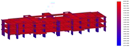 - When the replacement area 2 of the composite shear wall with the red box of 1–3F is filled with high-strength concrete without shrinkage and reaches the design strength, the finite element software calculation results are shown in Figure 20. At this stage, the composite shear wall has already been replaced in area 1, and the vertical displacement of replacement area 2 is reduced compared to replacement area 1, indicating that area 1 has entered work at this stage.