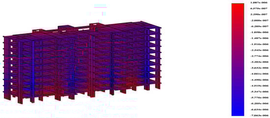 - The initial state of the structure is a shear wall structure that has been built up to the 10th floor; the finite element software calculation results for this state are shown in Figure 19. At this point, except for the stress deviation caused by structural irregularity away from the stairwell shear walls, the stress distribution in each area of the shear walls is homogeneous.
