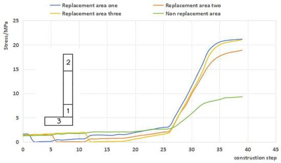 - Due to space limitations, we select an L-shaped wall in the structure (located on the lower left wall in Figure 14) to analyze the stress changes in each section of the wall limbs during the entire construction loading process. Figure 21 shows the vertical stress variation in the wall in different replacement areas throughout the entire process; during the replacement stage, the vertical stress in the non-replacement area remains at a high level. In replacement areas one and two, the vertical stress in area three is slightly higher than that in the non-replacement area, which is mainly due to the uneven deformation of the overall structure. The overall change pattern during the replacement phase is that the area that has been replaced first experiences high stress, while the area replaced later experiences low stress and is added to the overall work. During the construction phase of floors 11–18, the vertical stress in each area steadily increases; under the action of the ultimate load, the non-replacement area is unable to bear higher stress due to the influence of material strength. As the load gradually increases, the stress level in the non-replacement area is the lowest, and the replaced area mainly participates in the stress, playing the role of non-shrinkage high-strength concrete; until the structural loading is completed, the vertical stress in region one is 21 MPa, being 18.9 MPa in region two, and 21 MPa in region three, while the vertical stress in the non-replacement region is only 9.3 MPa.