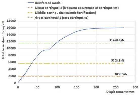 - Figure 23 shows the load–displacement curve of the reinforced overall structure obtained by applying horizontal loads (vertical loads applied at once, horizontal loads applied step by step) according to the “prescribed horizontal force” (seismic code). As shown in the figure, in the early stage of loading, the load–displacement curve roughly changes linearly, and the structure is in the stage of elastic deformation; when the total horizontal load of the structure is applied to 8800 kN, the structure enters the stage of elastic–plastic deformation, and the displacement accelerates with the increase in load. The horizontal ultimate bearing capacity of the reinforced structure can reach 15,906.36 kN, which is about 8.7 times larger compared with the elastic “small earthquake” result of 1836.3 kN (calculated using the PKPM software (Version2020) package), 2.9 times larger compared with the elastic “medium earthquake” result of 5508.8 kN, and 1.4 times larger compared with the elastic–plastic “large earthquake” result of 11,470.8 kN. This indicates that the reinforced overall structure meets the seismic bearing capacity requirements.
