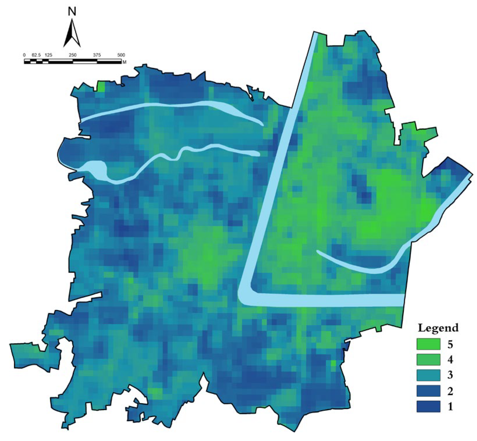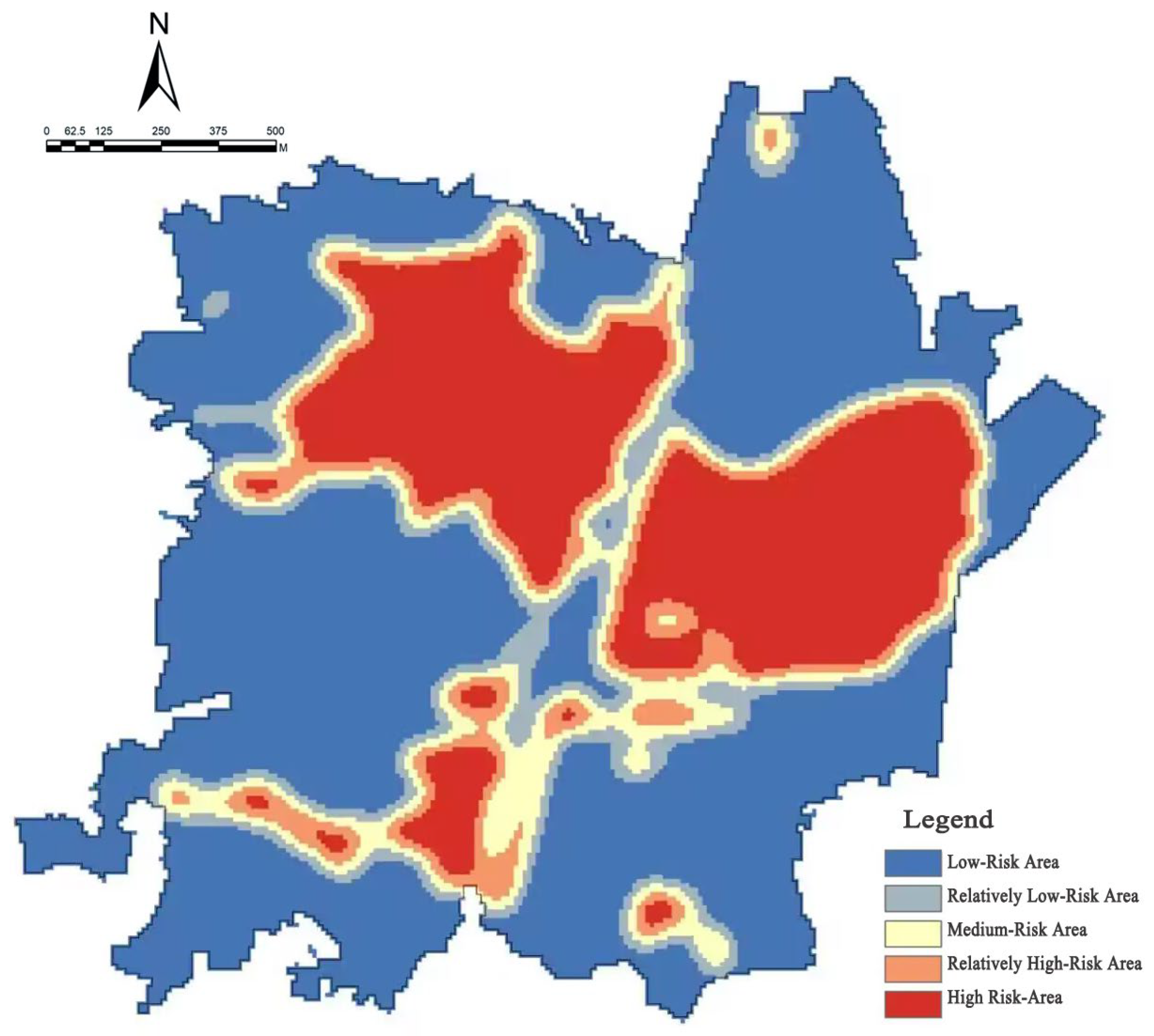 - Resilience assessment and spatio-temporal differentiation characteristics: The comprehensive index of historical hydrological resilience (HHRI) of Baoyan Village is 0.67, showing an overall downward trend compared to the historical benchmark. The spatial pattern shows a significant differentiation of “core vulnerability–marginal resilience”, with high-risk areas (12.7%) highly concentrated in the historic town area along the old Tongji River, which is also a densely populated area of cultural heritage, revealing the common challenges faced by flood safety and cultural protection.