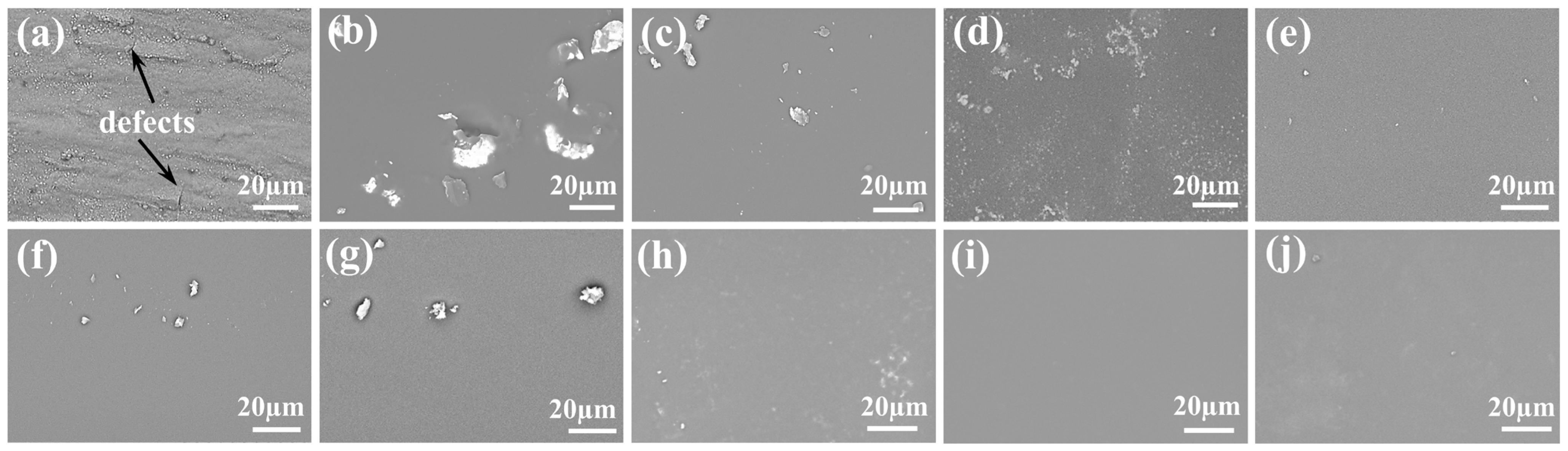 SEM images of HRB400 steel and HRB400 steel samples immersed in sol-gel solutions (pH = 10) with different metal ions: (a) Blank HRB400 steel; (b) Undoped sol-gel; (c) LS film; (d) NS film; (e) 0.8LNS film; (f) 0.2LNS film; (g) 0.05LNS film; (h) 0.5 wt% 2-MI—0.8LNS film; (i) 1 wt% 2-MI—0.8LNS film; (j) 2wt% 2-MI—0.8LNS film.