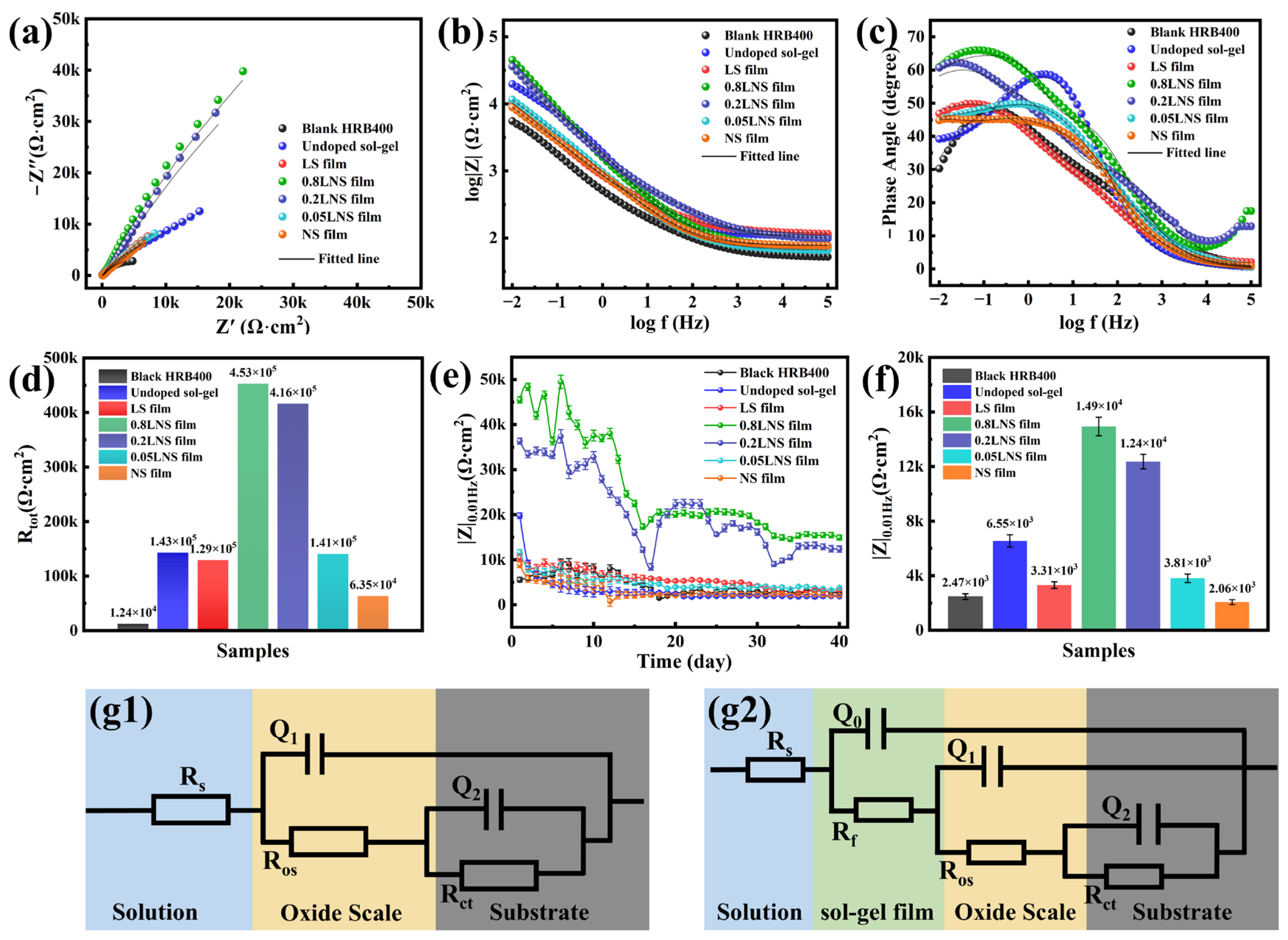 Electrochemical impedance plots of steel bars immersed at 400 °C in sol-gel solutions with pH = 10 and different Cla3+:CNi2+ ratios after treatment in 0.1 M NaCl + SCP solution: (a) Nyquist plots and fitting data; (b,c) Bode plots and fitting data; (d) comparison of fitted Rtot for different samples; (e) variation in low-frequency |Z|0.01Hz modulus for different samples during 40 days of immersion; (f) comparison of low-frequency |Z|0.01Hz modulus for different samples on the 40th day of immersion; equivalent circuit diagrams for different samples: (g1) represents the fitting circuit for unmodified mill-scale steel; (g2) represents the fitting circuit for mill-scale steel with sol-gel film.