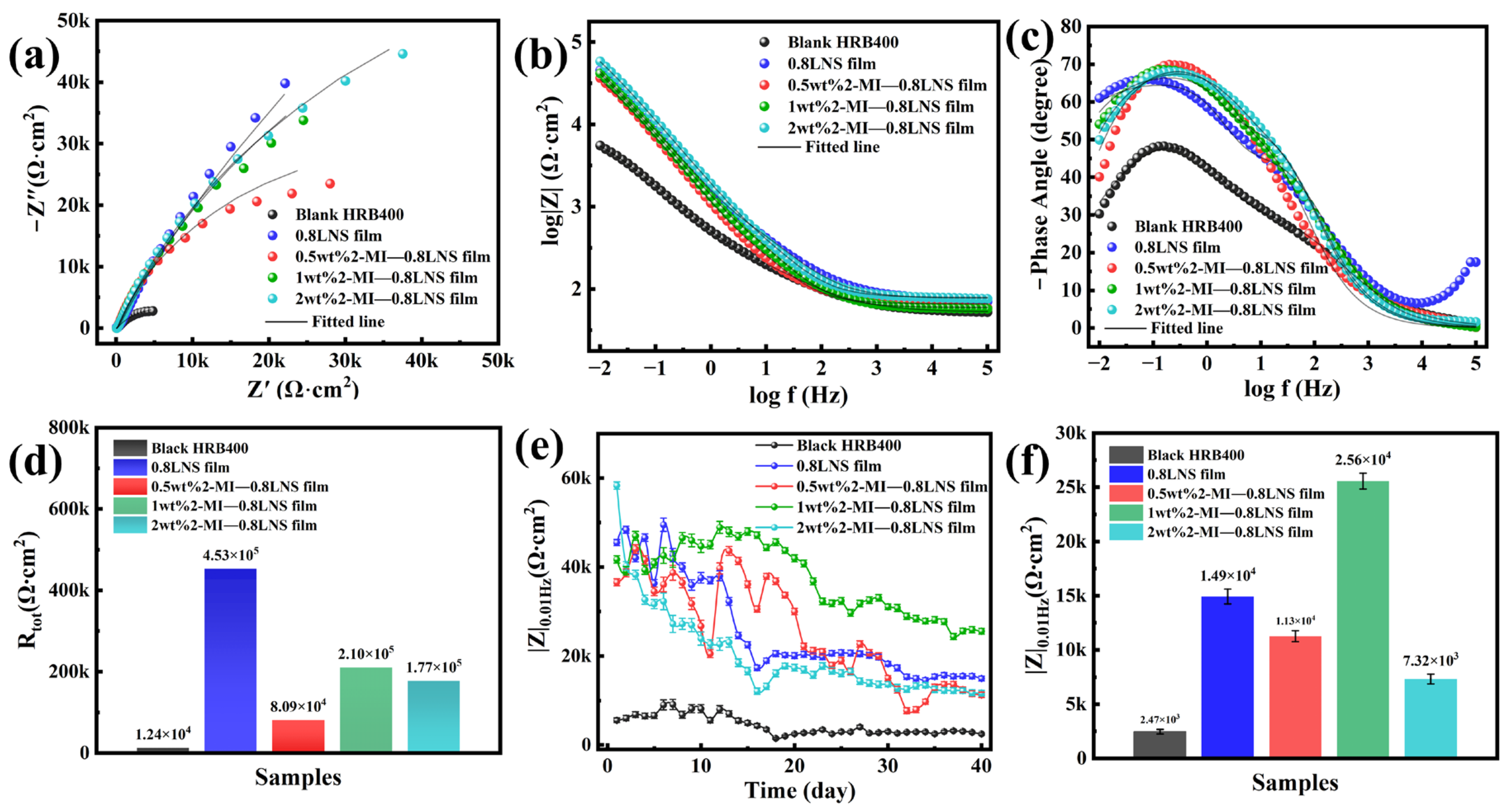 Electrochemical impedance plots of steel bars immersed at 400 °C in pH = 10 solutions containing 0.8LNS film with different 2-Methylimidazole contents after treatment in 0.1 M NaCl + SCP solution: (a) Nyquist plots and fitting data; (b,c) Bode plots and fitting data; (d) domparison of fitted Rtot for different samples; (e) variation in low-frequency |Z|0.01Hz modulus for different samples during 40 days of immersion; (f) comparison of low-frequency |Z|0.01Hz modulus for different samples on the 40th day of immersion.