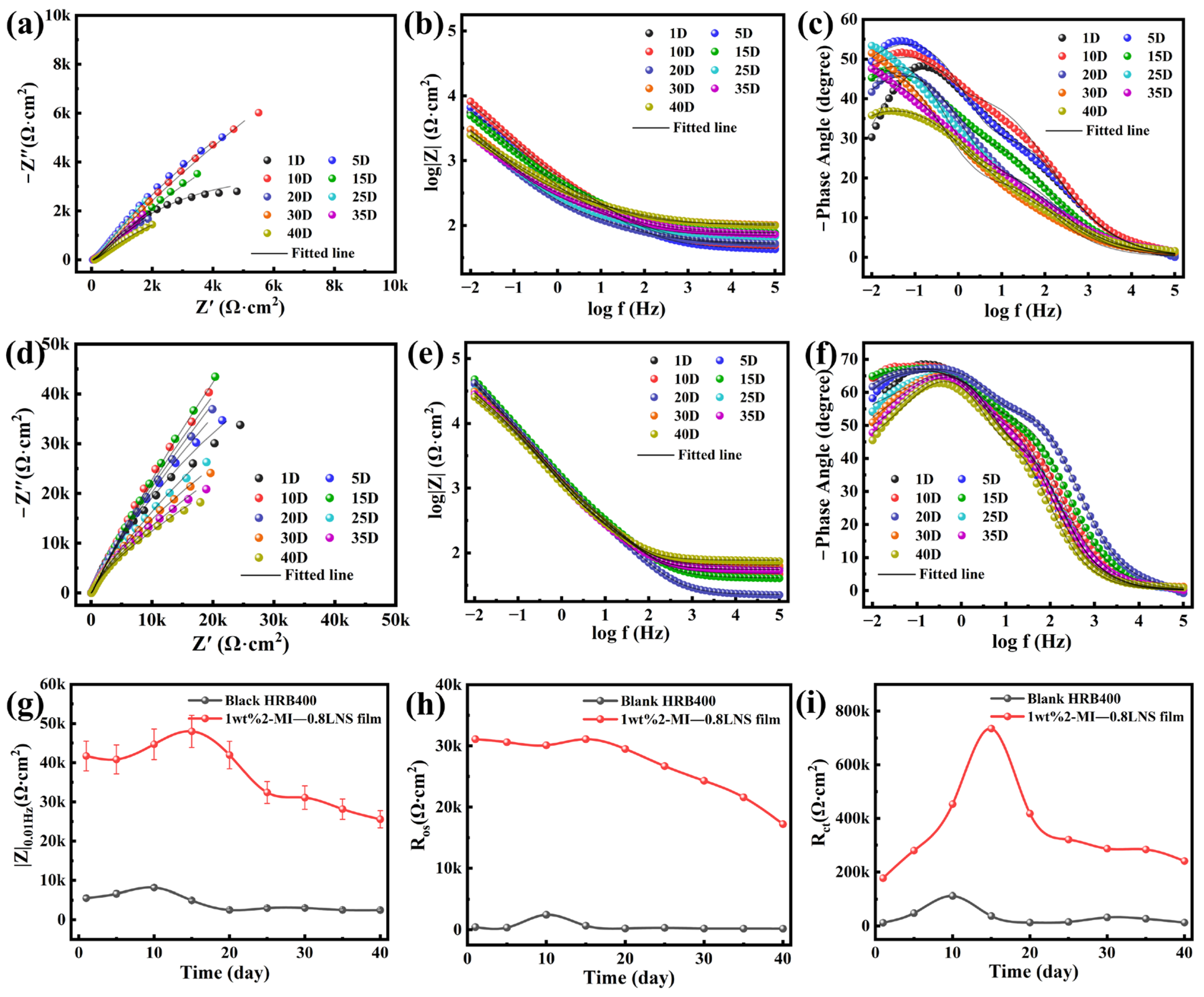 (a,d) Nyquist plots and fitting data; (b,e) and (c,f) Bode plots and fitting data; (g) low-frequency |Z|0.01Hz modulus variation during 40 days of immersion for Blank HRB400 steel and 1 wt% 2-MI—0.8LNS film in 0.1 M NaCl + SCP solution; (h) comparison of fitted Ros for both samples; (i) low-frequency Rct modulus variation for both samples on the 40th day of immersion.