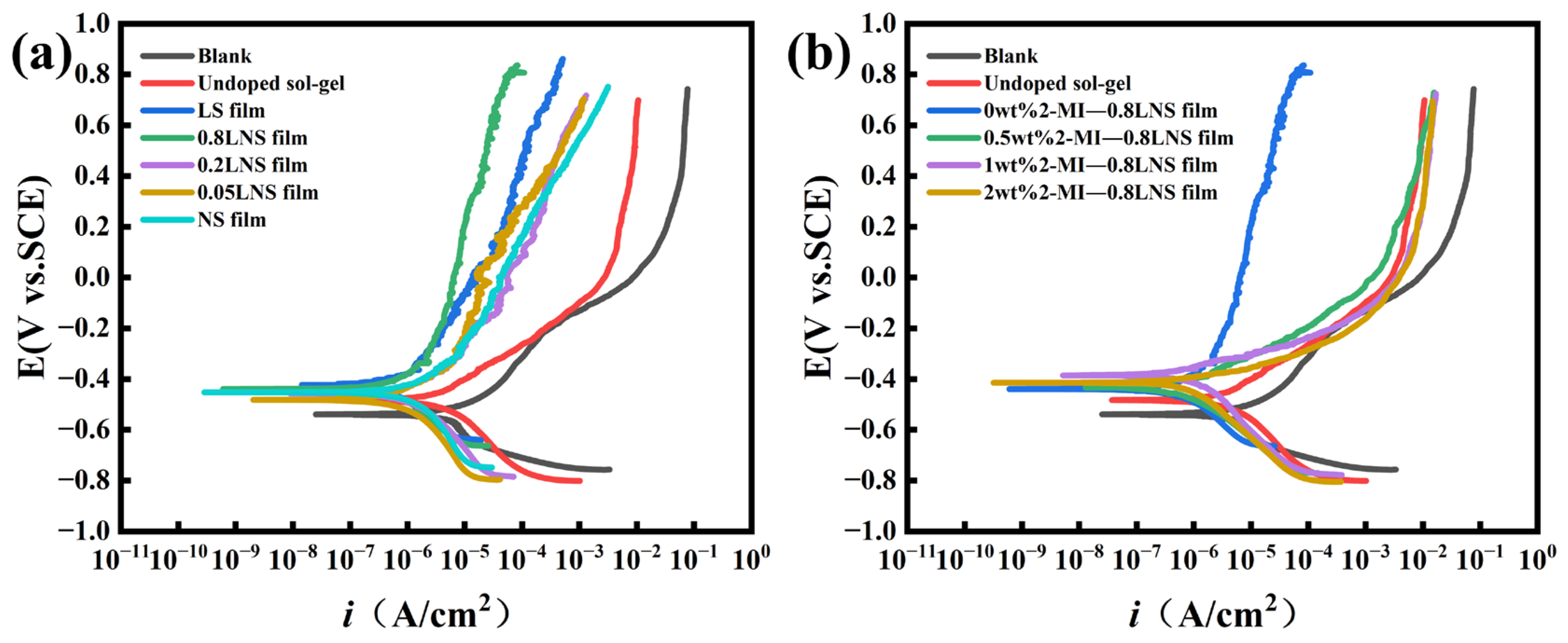 (a) Potentiodynamic polarization curves of unmodified steel with mill-scale and steel with mill-scale coated with sol-gel films prepared at different La3+/Ni2+ concentration ratios in 0.1 M NaCl-containing simulated concrete pore solution; (b) potentiodynamic polarization curves of coated steel bars with varying 2-Methylimidazole content added to the base (La3+/Ni2+ concentration ratio = 0.8) in 0.1 M NaCl-containing simulated concrete pore solution.