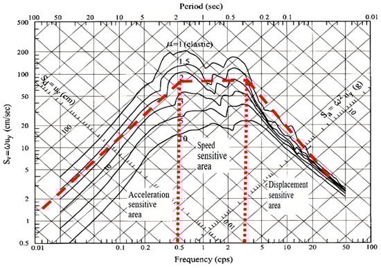 According to Riddell’s research, when the displacement, velocity, and acceleration response spectra of a structure are unified in a three-logarithmic coordinate system, a new tripartite response spectrum can be obtained, as shown in Figure 1.