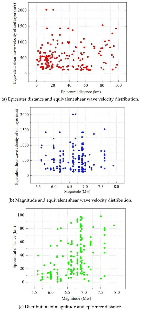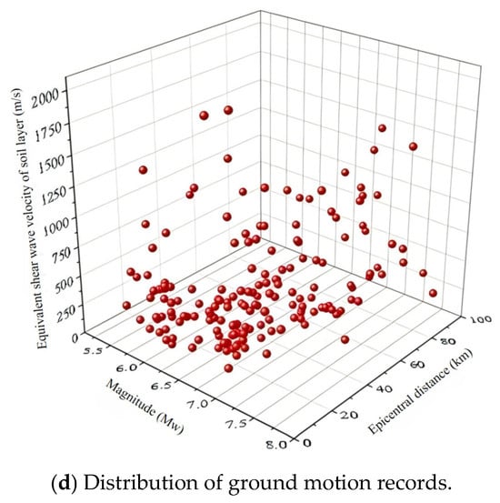 According to the above principles, 178 original ground motion records were selected from the PEER earthquake database NGA-West2 (PEER, 2013; data accessed on 15 March 2020). Figure 2a–d provide specific distributions of the selected ground motion records in terms of magnitude, epicentral distance, and soil equivalent shear wave velocity. Overall, the selected ground motion records exhibit a broad distribution in terms of magnitude, epicentral distance, and site type, ensuring that records with different seismic motion characteristics are encompassed.