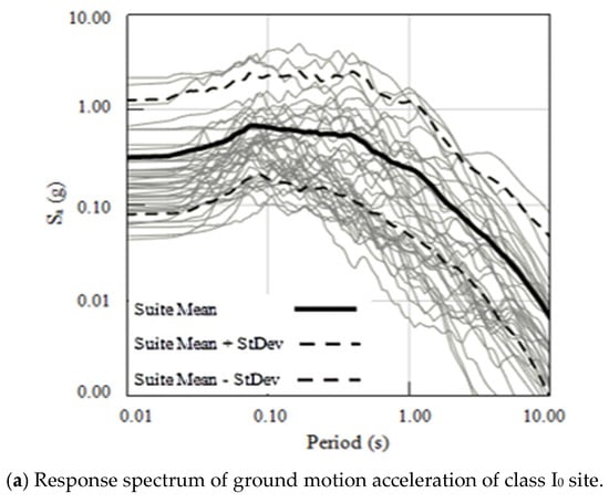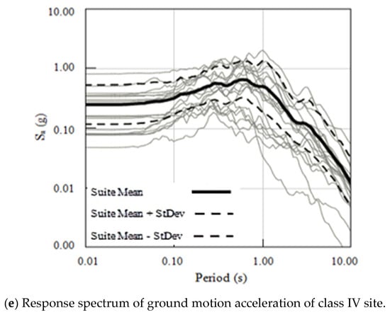 According to the aforementioned principles, the 178 selected ground motion records are classified into four categories based on the site type. With the exception of the category IV site, which includes only 18 ground motion records, all other site types consist of 40 ground motion records each. Within these site types, the ground motion record database for a category I site is further subdivided into two subcategories: I0 and I1 (refer to Table A2, Table A3, Table A4, Table A5 and Table A6 in the Appendix A). Figure 4a–e, respectively, show the acceleration response spectrum curves of the damping ratio of the ground motion recording library of different site types in logarithmic coordinates.