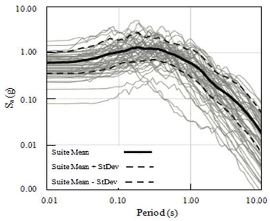 In previous research [], it was assumed that the structural probability seismic demand follows a lognormal distribution. This assumption was verified by conducting tests. The maximum deviation between the hypothetical cumulative lognormal distribution and the observed cumulative distribution was calculated using the following equation:
