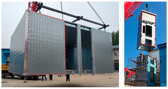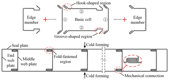 A novel CFS built-up closed section member, namely the fold-fastened multi-cellular steel panel (FMSP), was introduced. As shown in Figure 2, the FMSP was composed of edge and basic members, which were connected by fold-fastened regions formed by mechanical embedding of hook-shaped and groove-shaped regions. The proposed FMSP directly addressed these limitations [40,41,42]: (1) The fold-fastened connection was achieved through an automated mechanical fold-fastened process, which drastically reduced on-site manual labor and enabled a higher degree of prefabrication and industrialized production. (2) The continuous, interlocking hook-and-groove connection created a unified force transfer path, mitigating the stress concentrations caused by discrete screws and thereby enhancing the overall structural integrity and continuity. (3) By eliminating the need to model individual screw connections and their localized effects, the FMSP simplified the structural design process. (4) The modular nature of the FMSP allowed it to be flexibly configured as beams, columns, walls, and floors by varying the cell number, as demonstrated in the experimental program (Table 1), thus providing a versatile solution for complex engineering projects beyond the scope of traditional column members. FMSP has been applied in prefabricated buildings, as shown in Figure 3.