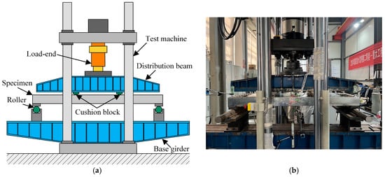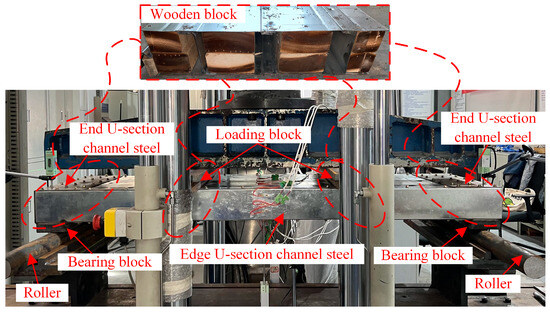 Since the wooden blocks were primarily in compression during testing, and the compressive stress they experienced was significantly lower owing to a larger bearing area, they exhibited negligible strain compared to the panel itself under actual test conditions. Therefore, these wood blocks could be considered rigid relative to the panel. It should be noted that the primary function of the wood blocks was to distribute loads to the panel and prevent local buckling, rather than to significantly participate in carrying bending stresses. To simulate the simply supported boundary conditions, the bearing blocks were welded under the U-sectional channel steel at the end, and the rollers were placed. The on-site assembly specimen is illustrated in Figure 4.