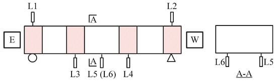 The four-point bending test was used to evaluate the flexural behavior of the specimens. The test was completed on a 1000 kN compression testing machine. The test setup and on-site photos are shown in Figure 6. Six linear variable displacement transducers (LVDTs) were mounted to measure the deflections at the midspan, loading point, and support point, as shown in Figure 7.