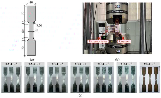 Considering the error between the measured and design strengths, the tensile test was carried out before the bearing capacity test. The tensile test coupon was designed according to GB/T 228.1-2021 [50], as shown in Figure 8a. The tests were conducted using an INSTRON 8802 universal testing machine (Instron-Division of ITW Ltd., Egham, UK). To accurately capture the material’s yield behavior, a 50 mm gauge-length extensometer was attached to the middle portion of the coupon to measure the tensile strain. The loading was applied under displacement control at a constant rate of 1.0 mm/min until the coupon fractured. The loading process is presented in Figure 8b. According to the thickness, the steel S350 was divided into #A and #B, and three tensile coupons were taken in the outer and web plates, respectively. For steel Q355, it was divided into #C, #D, and #E according to the thickness, and three tensile coupons were taken for each group. The specific results are shown in Table 3 and Figure 8c. The yield strength fy, ultimate strength fu, and elastic modulus E of each coupon in the same group were relatively close.